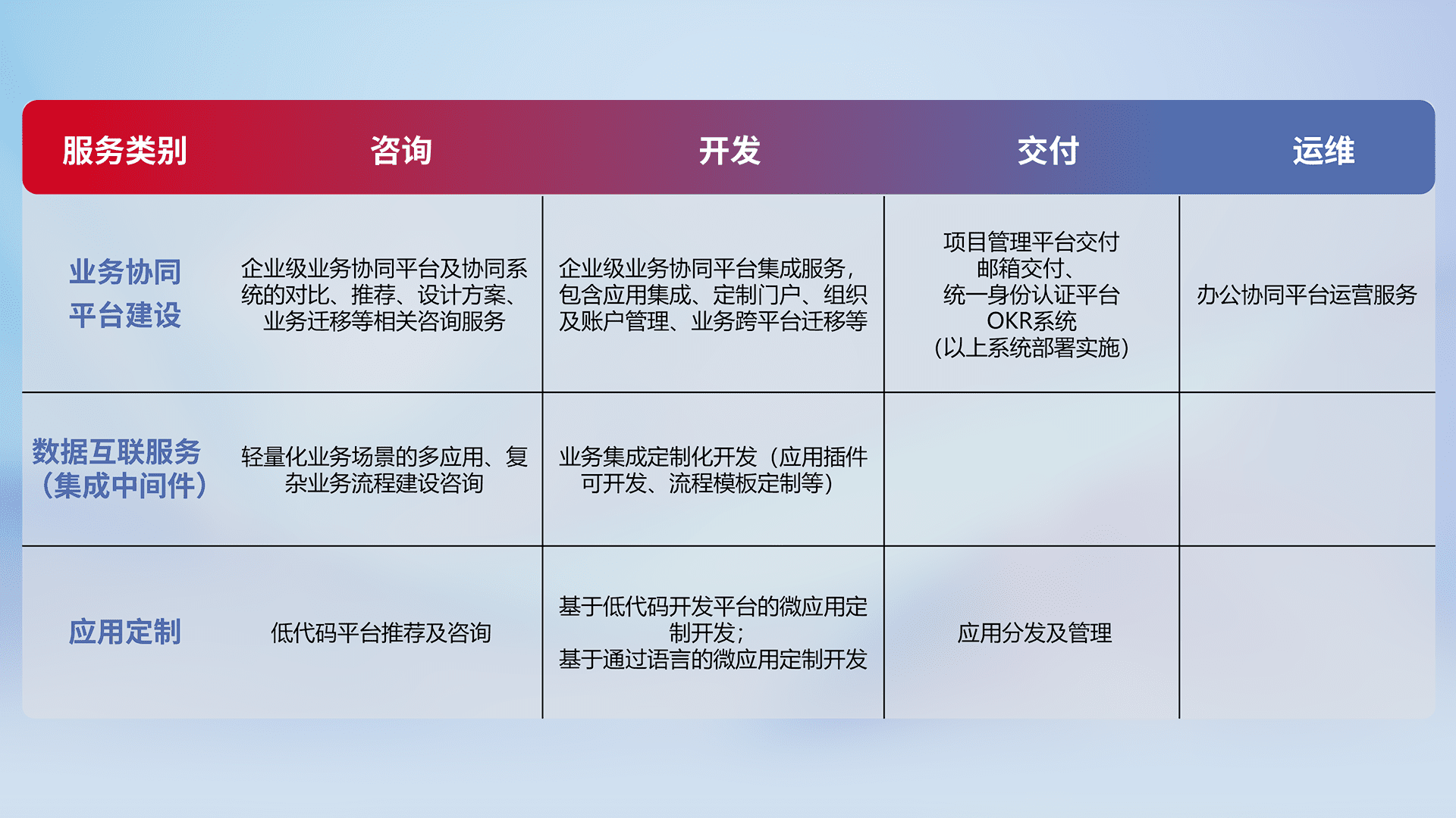 针对钉钉、、、、企微、、、IDaas等平台级产品提供产品的规划、、、方案、、、交付、、、定制化开发等服务,,实现如统一协同办公、、、、智能客户服务、、、混合会议管理、、智能数据查询、、等业务场景,,,,实现数字化转型。。。。